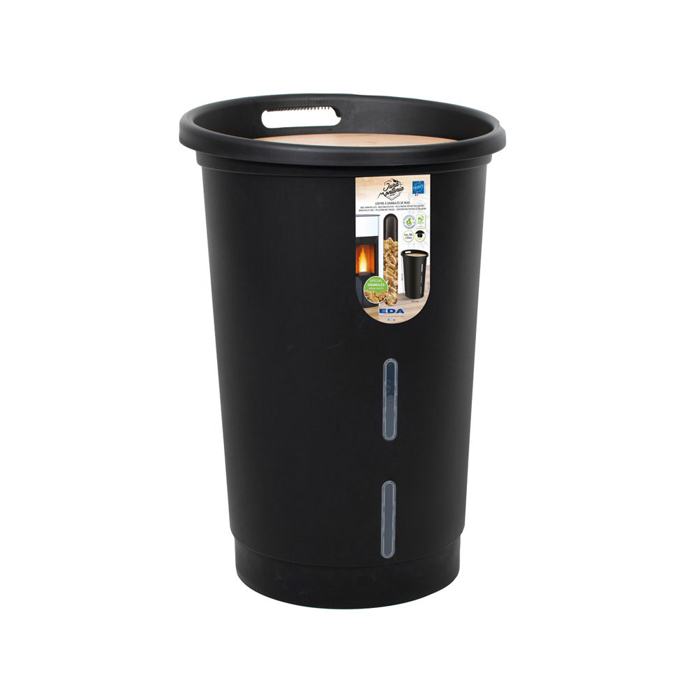 Ce coffre à granulés noir aux courbes douces et modernes vous permettra de stocker jusqu’à 25 Kg de pellets.
