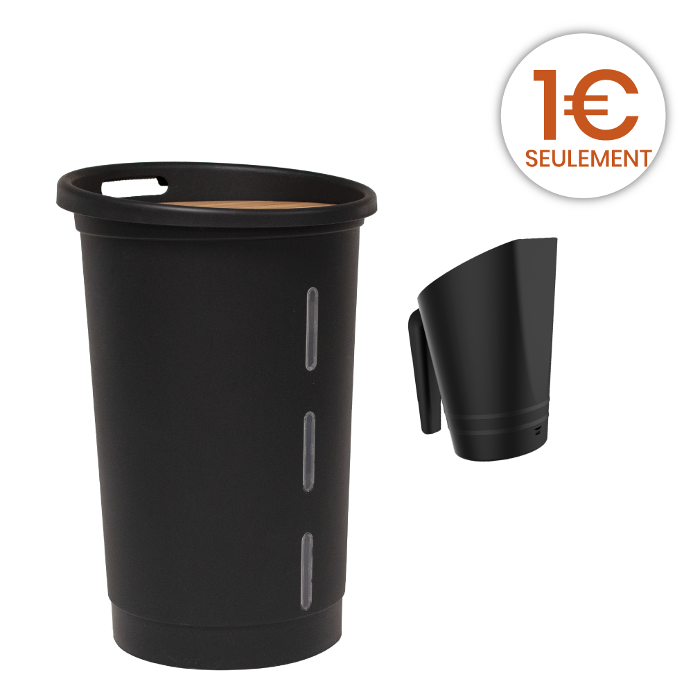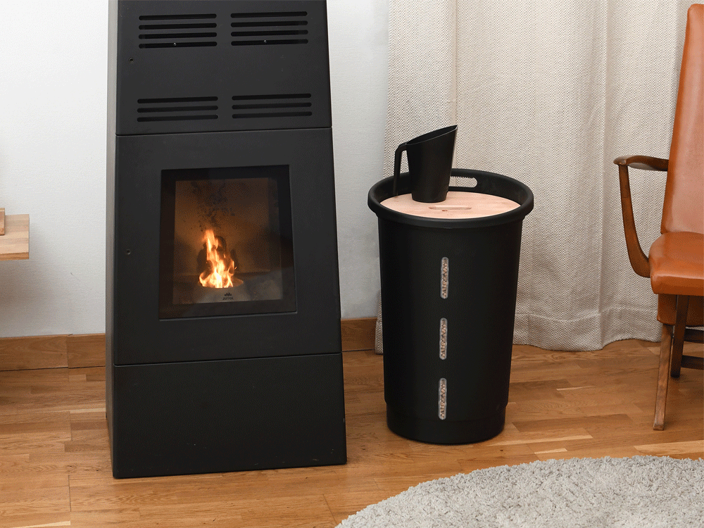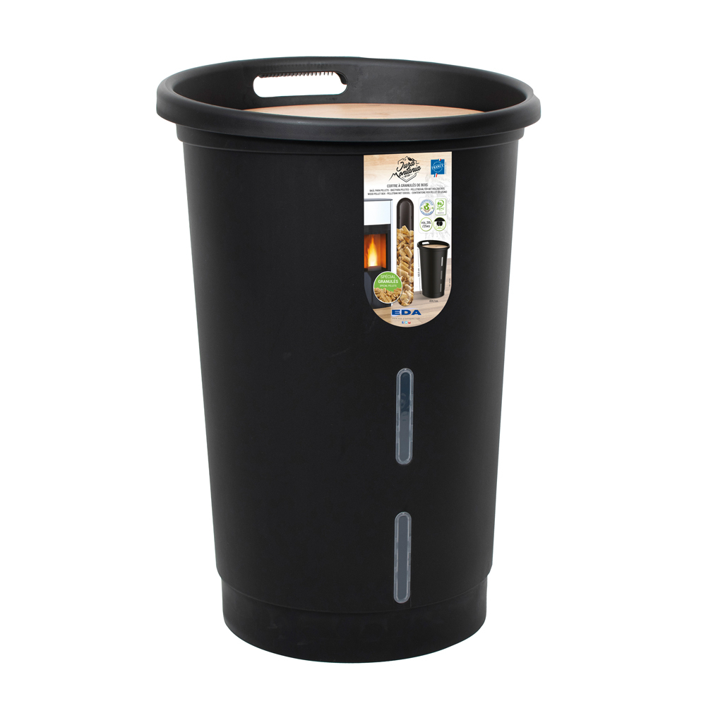 Ce coffre à granulés noir aux courbes douces et modernes vous permettra de stocker jusqu’à 25 Kg de pellets.