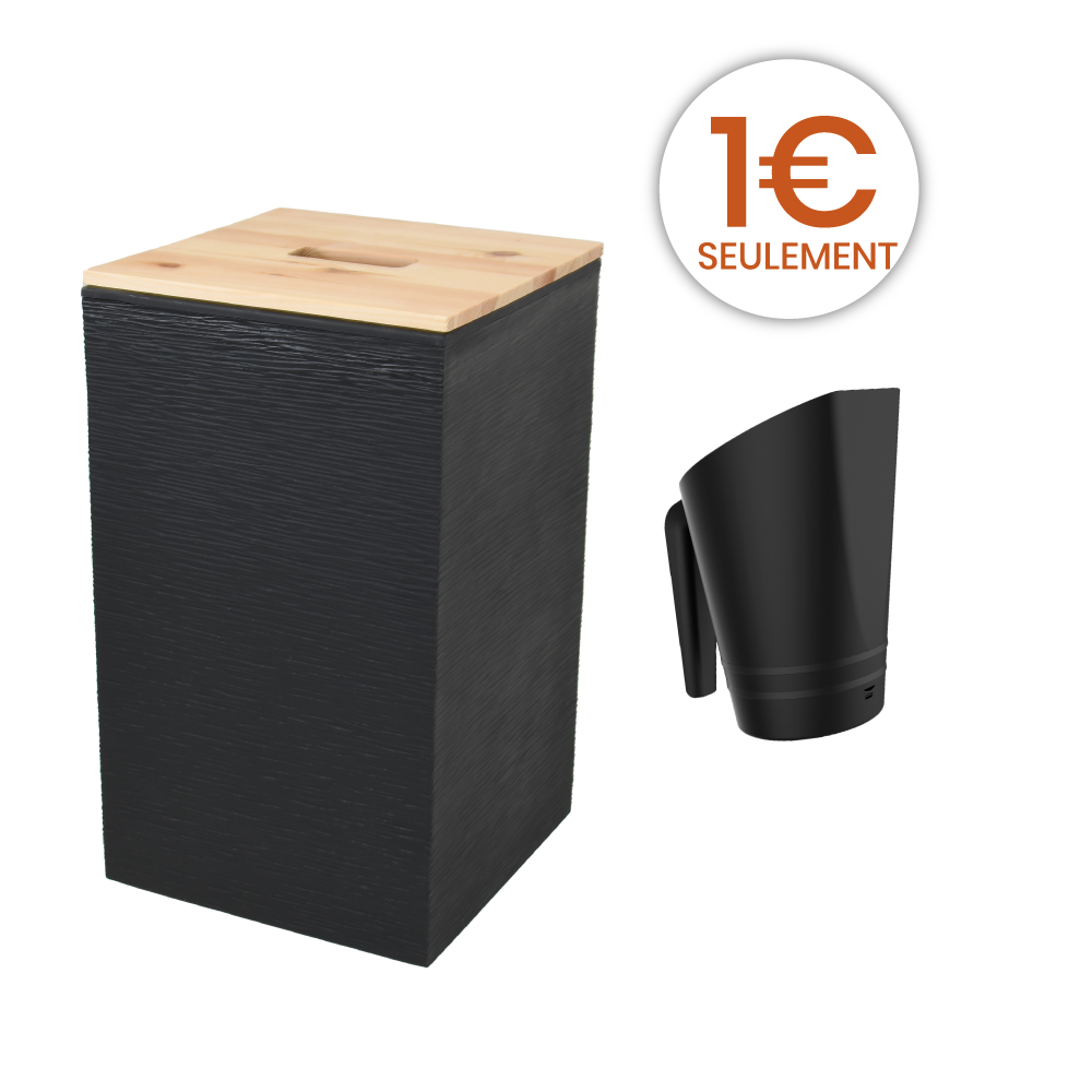 Ce coffre à granulés noir aux courbes douces et modernes vous permettra de stocker jusqu’à 20 Kg de pellets.